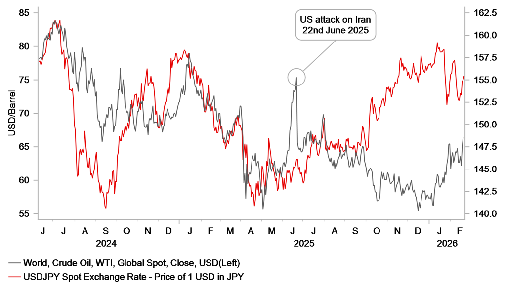 From the intra-day low last week, USD/JPY has rebounded three big figures that suggests the post-election yen buying on the liquidation of shorts has run its course and could open up scope for further gains over the short-term. The checking of rates in USD/JPY by the Federal Reserve in January has also deterred any aggressive renewed yen selling although as time passes the impact of that will likely fade. For now though, the relative stability in the JGB market has removed one source of previous yen selling that could also limit the scope to the upside. However, geopolitical risks could change all of that suddenly. The US dollar has gained broadly this week, in part of better US data and reduced Fed rate cut expectations but also on prospects of a renewed attack on Iran by the US. This did not materialise this weekend but President Trump has stated that Iran has 10-15 days to make a deal. That will keep investors focused on this risk this week. In June 2025 when the US attacked Iran’s nuclear facilities, USD/JPY advanced around 3.5% in the run up to and immediately after the attack. A crude oil surge is clearly a negative for the yen that could yet encourage renewed selling, especially if the US dollar remains broadly supported across G10.