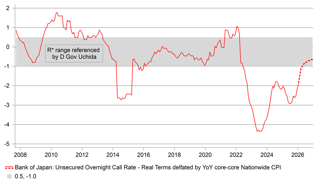The policy focus laid out on Friday to keep pushing for growth and to drive investment-led fiscal spending will likely mean the BoJ will be required to tighten its monetary stance. The probability of a hike at the meeting on 28th April is currently about 70%. If the FY26 budget is passed by then and USD/JPY remains around current levels, the pressure will intensify for the BoJ to act. The policies of PM Takaichi look to be quickly having an impact on sentiment. The Manufacturing PMI jumped to 52.8 in February, the highest since May 2022. We see the government giving more freedom to act as a quid-pro-quo in helping stabilise the JGB market. Washington may also be applying pressure for the BoJ to act and getting the yen on a firmer footing after the Fed checked rates in January will be part of that. Next week may be when the government announces its picks to replace two BoJ Board members – Asahi Noguchi and Junko Nakagawa. Both on the dovish side of the spectrum and hence we could see overall balance of the Board turn a bit more hawkish. The nationwide CPI data on Friday was a little weaker than expected but we do not see that altering the prospects of an April rate hike – continued weaker prints would certainly put doubts on further hikes but not at this stage when the policy stance still requires further tightening. Getting to a zone of R* is still some distance away and hence a hike by April is still required in our view.