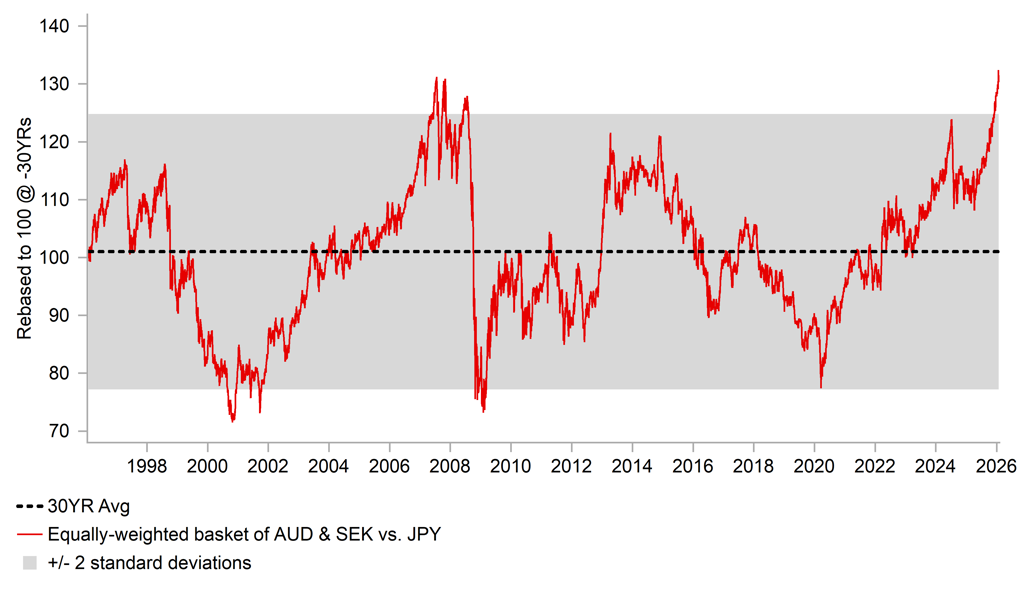 If the JPY continues to strengthen, market participants are likely to become increasingly wary of the risk of a more disruptive unwind of JPY‑funded carry trades, similar to what was seen between July and August 2024. On that occasion, the S&P 500 equity index fell by almost 10% as risk assets were hit hard by the rapid carry unwind. Such a development would threaten the recent outperformance of high‑beta carry currencies, including the AUD among G10 currencies, as well as emerging market currencies that have benefited from a weaker USD, rising commodity prices, and a backdrop of low financial market volatility.
