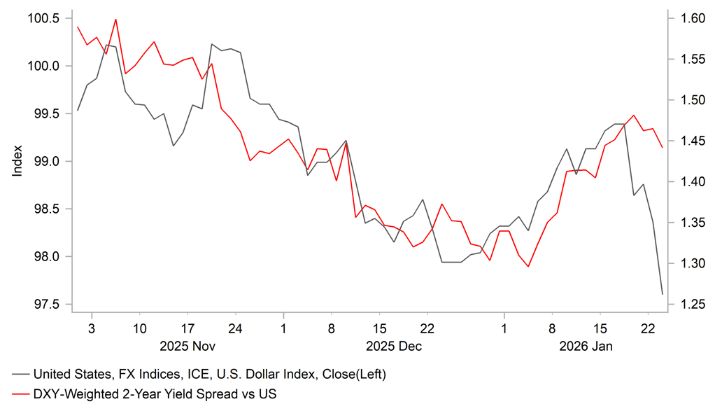 The recent divergence between USD performance and yield spreads has been driven by a renewed increase in U.S. policy uncertainty, which has weighed on the USD much as it did last year. President Trump’s threats toward fellow NATO allies over Greenland, while short‑lived, may nonetheless have a more lasting negative impact on investor confidence and could further encourage foreign investors to increase FX hedging on U.S. asset holdings. This comes at a time when President Trump has launched a fresh attack on the Federal Reserve’s independence, threatening Chair Powell with a potential criminal indictment related to his testimony to Congress on cost overruns associated with a Federal Reserve headquarters renovation project. While we do not expect these attacks to force the Fed to cut rates, they are likely contributing to a gradual erosion of investor confidence in U.S. policymaking, which remains a headwind for USD performance. Second, the weaker USD may also reflect growing investor optimism around the outlook for stronger global growth this year. The outperformance of commodity‑linked G10 currencies such as the AUD, alongside gains in Latam FX at the start of the year, has been supported by improving global growth expectations and rising commodity prices. The SEK also stands to benefit, given Sweden’s status as a small and open economy. President Trump’s rapid policy U‑turn in dropping the threat of higher tariffs on fellow NATO members, including France, Germany, and the UK, has helped ease downside risks to global growth by reducing the likelihood of another tit‑for‑tat trade war between the U.S. and the EU.
