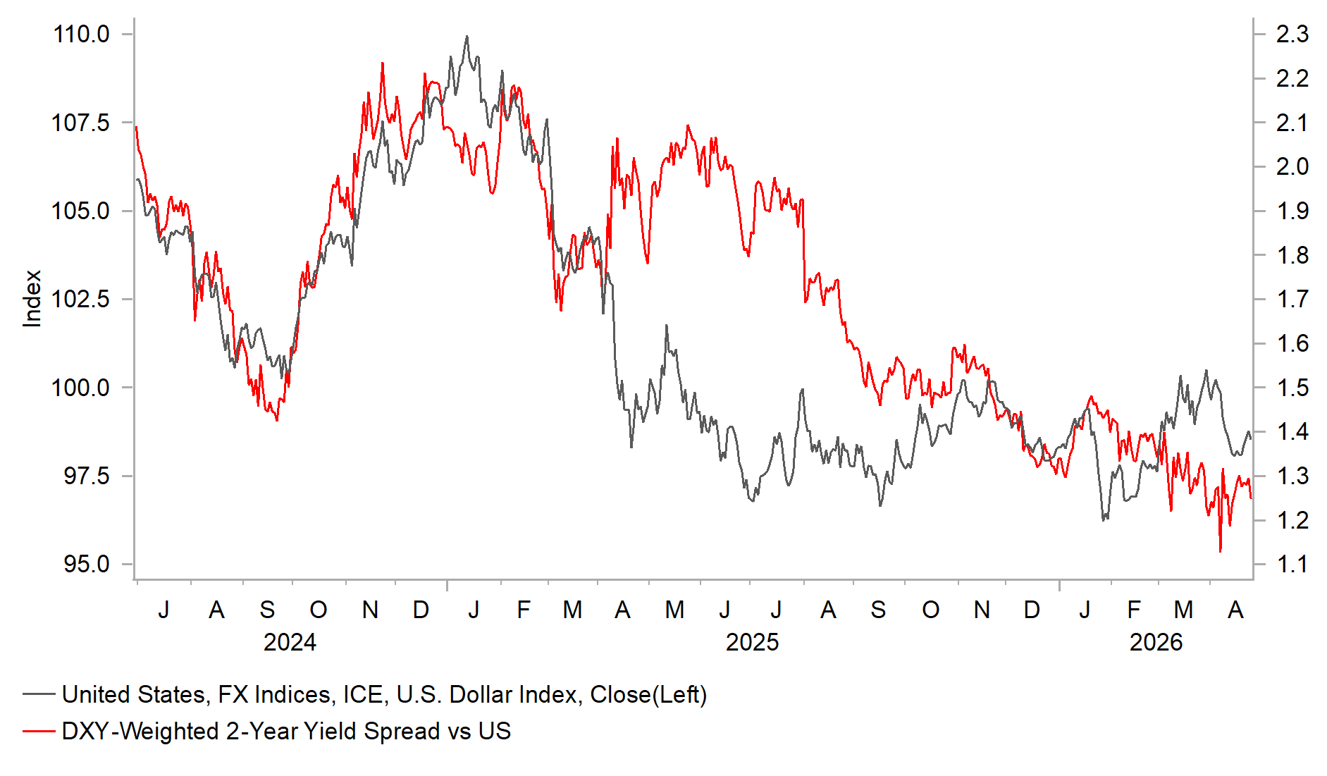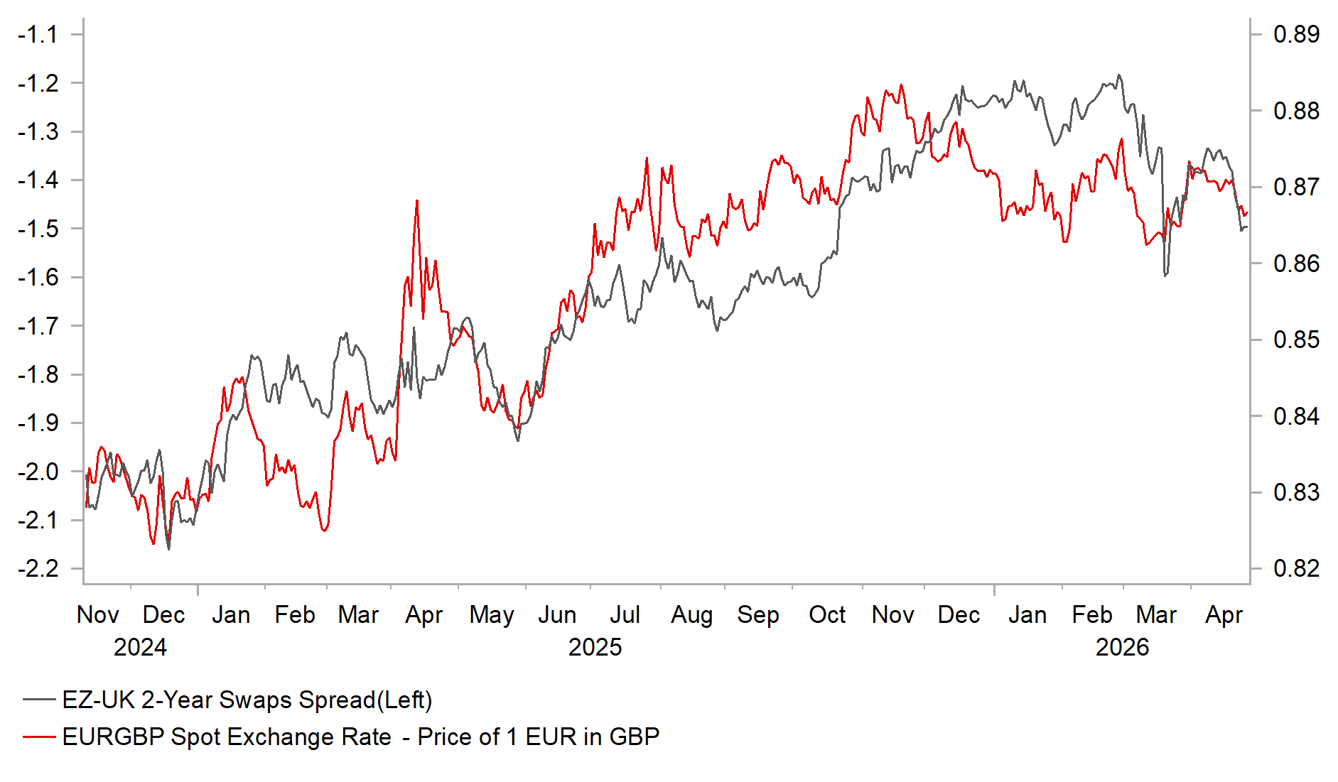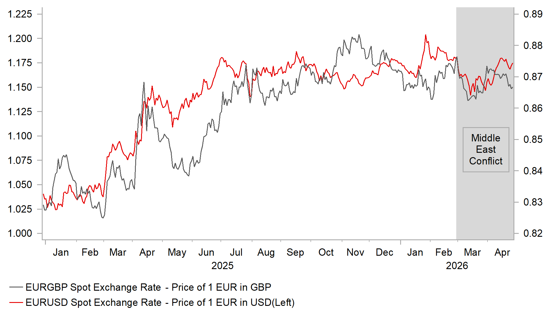 The GBP has held up better than the EUR over the past week, placing modest downward pressure on EUR/GBP, although the pair has remained within a relatively tight 0.8600–0.8800 range since the conflict began. The GBP has been supported by further evidence that the UK economy started the year with more underlying momentum than previously expected, while the initial negative impact of the energy price shock has so far appeared limited. Prior to the energy shock, the UK economy expanded solidly by 0.5% in February and remains on track to grow by around 0.6% in Q1. This compares favourably with earlier Bank of England staff estimates that had pointed to underlying growth of just 0.1%–0.2% in Q1. In contrast to the euro‑zone, the latest UK PMI surveys also showed an improvement in business confidence in April, although this followed a sharp decline in March.
