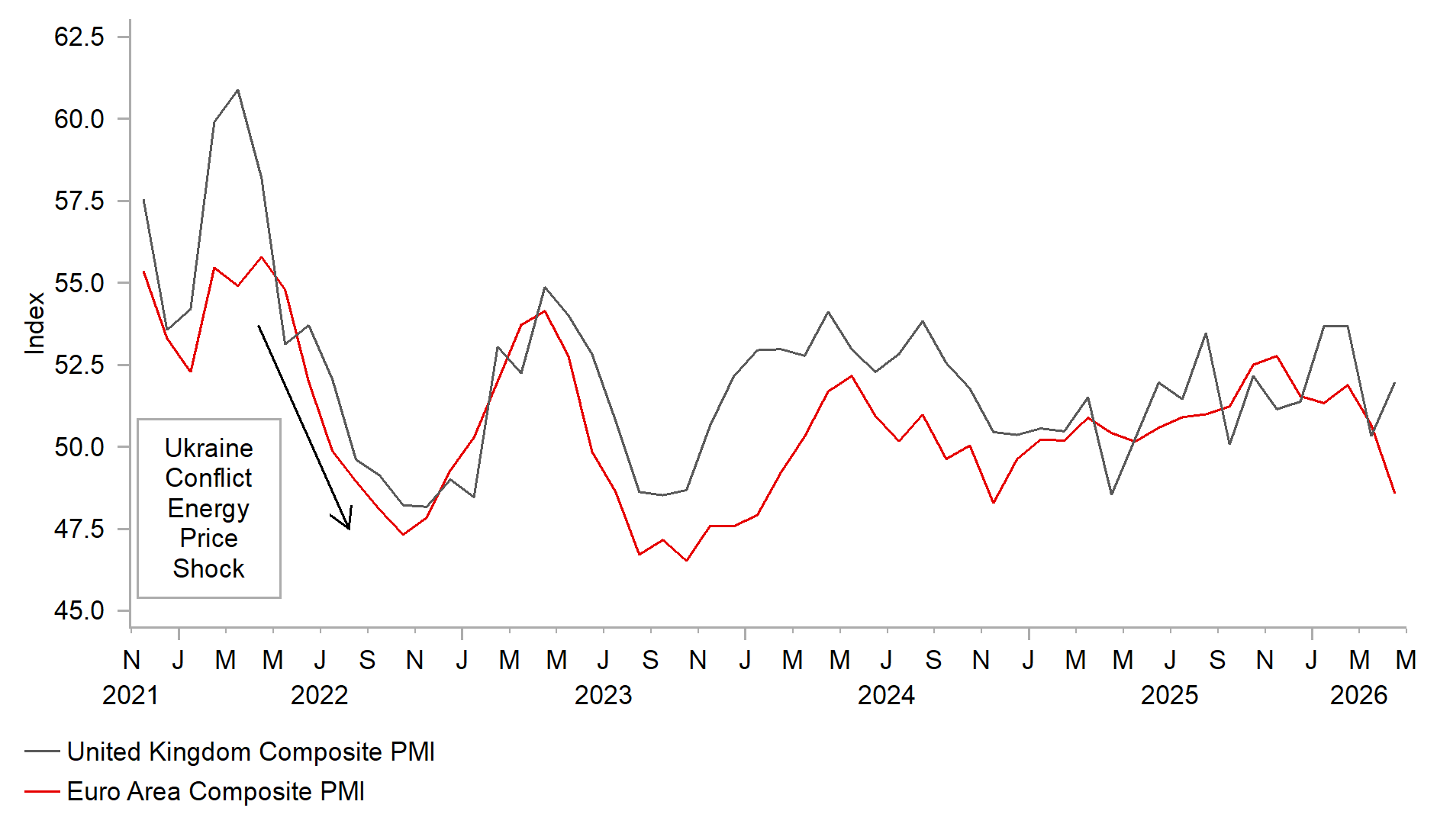 The initial negative impact of the energy price shock on the euro‑zone economy was evident in the latest PMI surveys for April. The surveys showed that business confidence fell sharply in the services sector, while holding up better among manufacturers. The euro‑zone services PMI declined by 2.8 points to 47.4 in April, whereas the manufacturing PMI rose by 0.6 points to 52.2. For the euro‑zone economy as a whole, the composite PMI dropped by 2.1 points to 48.6, marking its weakest level since November 2024. The index has now fallen by 3.3 points since February, prior to the Middle East conflict. Business confidence has deteriorated more quickly than during the previous energy price shock triggered by Russia’s invasion of Ukraine in early 2022 and is already at much weaker levels. On that occasion, the composite PMI fell by 8.5 points between April and October 2022. The current level of the composite PMI is already signalling that economic growth may stagnate at the start of Q2. Stagflation risks were further underscored by a sharp rise in both the input and output price sub‑components, which each increased by just over three points.