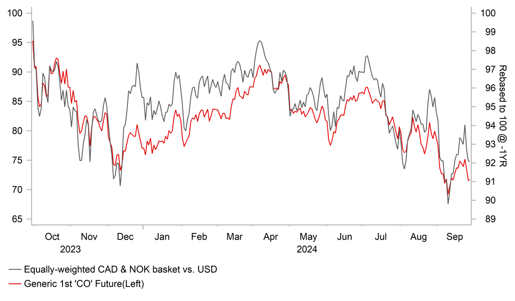 The policy shift from China quickly follows the dovish policy pivot from the Fed after they delivered a larger 50bps rate cut earlier this month. The Fed’s decision to lower rates has created more room for the PBoC and other global central banks to keep lowering rates without increasing the risk of much weaker domestic currencies. It is a favourable development for the global growth outlook and has helped to ease investor concerns over a harder landing for the global economy. Global commodity prices have already started to respond with Bloomberg’s commodity price index rising by around 7% from this month’s lows and reversing weakness over the summer. However, there are still pockets of weakness amongst commodity prices. In recent days the price of oil has fallen back towards year to date lows undermined by concerns that a shift could also take place in the strategy of OPEC+ members. The Financial Times reported that Saudi Arabia is ready to abandon its unofficial oil price target of USD100/barrel as it shifts its focus towards preserving market share. The report states that Saudi Arabia is committed to increasing production as planned on 1st December after the recent two month delay according to people familiar with the country’s stance. While the report has not been officially confirmed, it does pose downside risks to our forecast (click here) for the price of oil to be held between USD80 and 90/barrel in the year ahead. Oil supply concerns are currently dampening upward pressure on the price of oil from a potential pick-up in demand from China. The IEA recently downgraded their forecasts for China oil demand this year due to weakness over the summer. The lower oil price helps to explain why the NOK has underperformed this week.
