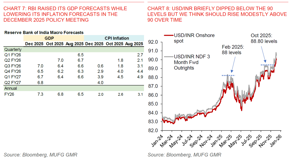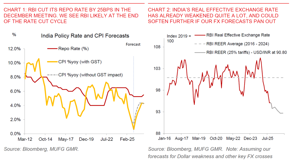 - The consensus expectation was very split ahead of the meeting, and we were expecting RBI to delay its rate cut to the February 2026 meeting given the strong real GDP print and uncertainties around the pace of INR weakness.