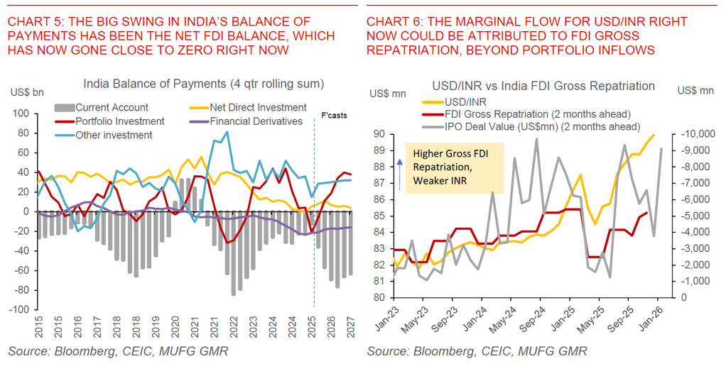 - To some extent, the marginal flow we see in USD/INR right now could potentially be attributed to FDI repatriation, beyond changes in foreign portfolio inflows (see IndiaPulse – What ails INR – Balance of payments remains unbalanced).