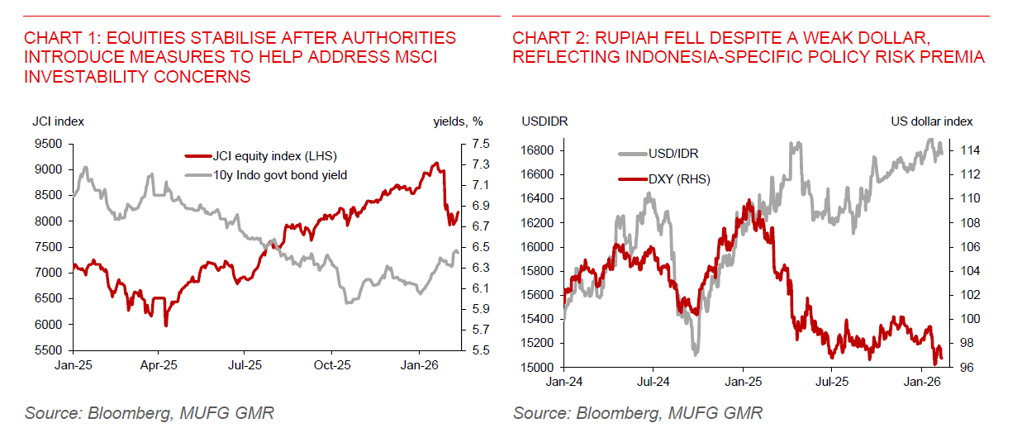 Despite solid growth momentum in Q4, Indonesia enters 2026 with increased policy and market uncertainty. MSCI has raised concerns over the investability of Indonesian equities, while Moody’s has revised Indonesia’s sovereign credit outlook to negative, placing downward pressure on local financial markets.
