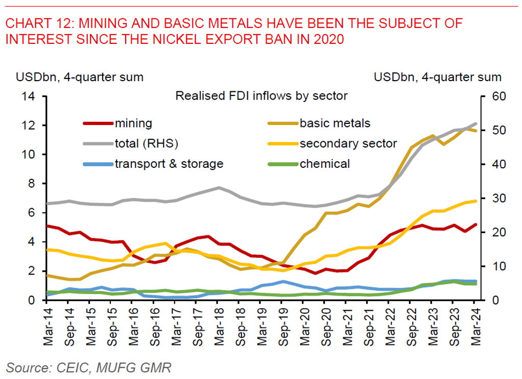 - Beyond the short-term headwinds, there’s scope for rupiah stability, given an improvement in the long-term appeal of the currency driven by the nickel export ban in 2020. Indeed, the nickel downstreaming policy has made significant positive contributions to the country’s trade balance and foreign direct investment (FDI) in recent years. Trade surplus in the basic metal sector has risen four-folds to US$14.5bn (1.1% of GDP) in 2023 vs. US$3.5bn (0.3% of GDP) in 2020, while the sector also added US$10.7bn (0.8% of GDP) to annual realised FDI inflows in 2023 compared to 2019 levels.