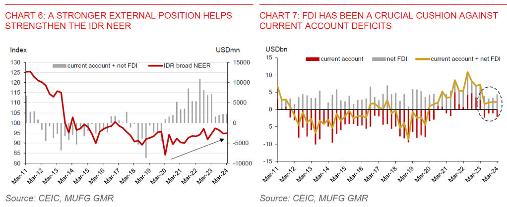 - However, from a medium- to long-term perspective, Indonesia’s economy will likely need to generate sustainable current account surplus and attract more FDI inflows to keep the rupiah relatively stable, in our view. Indeed, an improvement in the trade balance since 2021, along with net FDI inflows, have helped the IDR broad nominal effective exchange rate to appreciate (Chart 6). Also, net FDI inflows since Q2 2023 have helped provided an offset against renewed current account deficits (Chart 7).