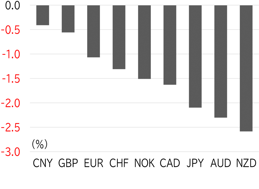 The USD/JPY opened the week at 149.89, rising to around 150 on Monday 9 December. Yen selling picked up after Prime Minister Shigeru Ishiba said Japan has not yet escaped deflation and China announced an aggressive fiscal and monetary policy stance, and the USD/JPY advanced to below 151.50 in US trading hours as the dollar strengthened along with a rise in UST yields. The pair rose to below 152.50 on 10 December as the dollar was bought in the absence of any notably news after European investors entered the market and as reports of a Japanese financial institution buying a US peer triggered yen selling. The USD/JPY fell back to below 151.50 on 11 December along with a fall in share prices and a decline in yen cross rates following news that Chinese authorities had approved a weaker yuan. However, yen selling gained momentum after Bloomberg reported that the BOJ could postpone a rate cut at its upcoming monetary policy meeting, and the USD/JPY swiftly rose to above 152.50. The pair fell back to around 152 as UST yields declined and upside was checked after the US CPI for November came in broadly in line with expectations. The USD/JPY subsequently tested 152 several times, but was bottom-firm and remained strong through to the close on 12 December along with a further rise in UST yields. The pair had recovered to above 153 at the time of writing this report on 13 December (Figure 1). The dollar was strong overall among G10 currencies this week. European currencies were reasonably strong, while the AUD, which is sometimes seen as a proxy for the CNY, was weak (Figure 2).