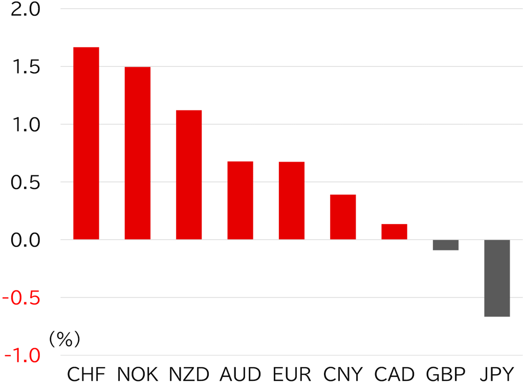The USD/JPY opened the week at 153.77. The BOJ's Summary of Opinions from the October Monetary Policy Meeting, released on the morning of 10 November, was taken as broadly hawkish, but yen selling persisted as risk appetite improved after the US Congress made progress on passing a stopgap budget to end the partial government shutdown. The yen weakened further on 12 November after comments by Prime Minister Sanae Takaichi were seen as signaling resistance to BOJ rate hikes, and the USD/JPY reached 155 during overseas trading. The psychological threshold capped gains, and the pair failed to hold above 155 on 13 November, edging lower instead. The USD/JPY fell below 154.50 in US trading hours amid a decline in share prices, bonds, and the dollar. The pair lost direction after that and was trading around 154.50 at the time of writing on 14 November (Figure 1). Among G10 currencies this week, both the dollar and the yen weakened. The Swiss franc strengthened during the stock market adjustment later in the week (Figure 2).