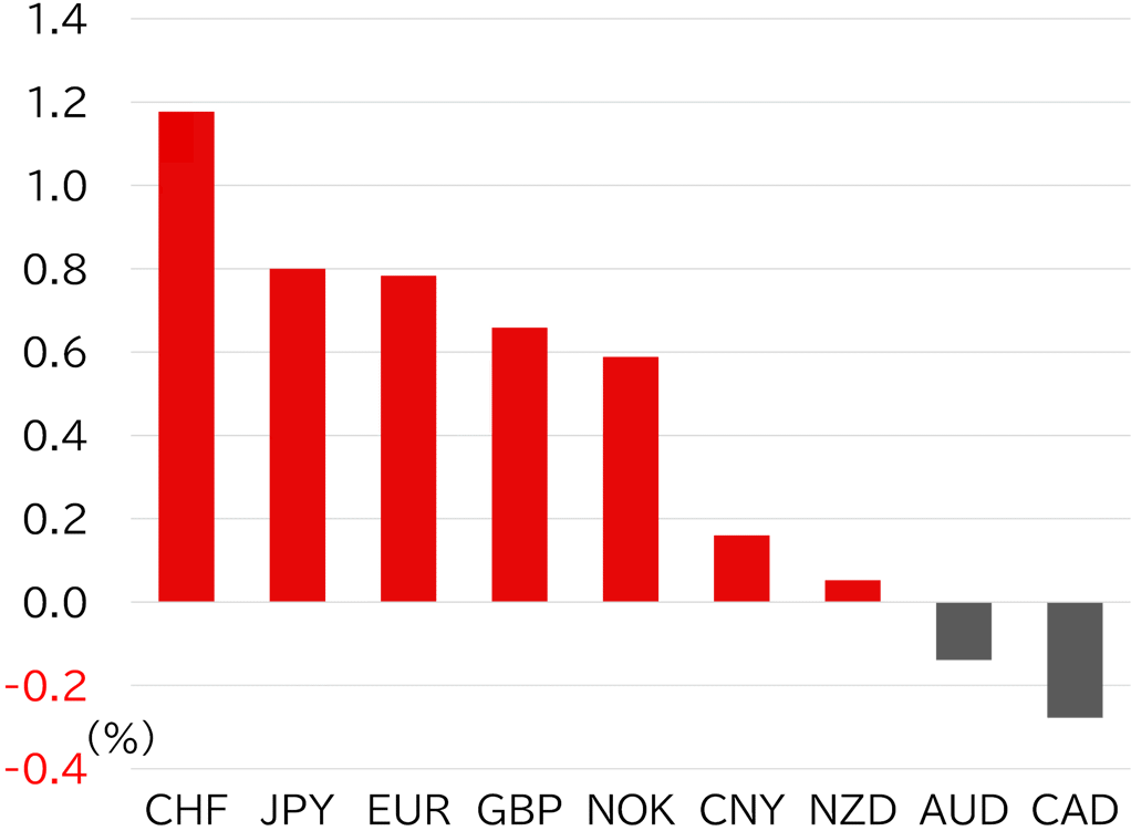 The USD/JPY opened the week at 152.08. Tensions between the US and China flared again after China imposed export restrictions on rare earths, but calm returned on Monday 13 October, a Japanese holiday, after US President Donald Trump soon softened his stance toward China. During European trading that day, the dollar strengthened and the pair rose to around 152.50, but risk-off moves led by falling share prices, rising bonds, and yen buying capped upside when Japanese investors returned on 14 October. The pair continued to trend lower mainly during Tokyo (Asian) hours and fell below 150.50 during US trading on 16 October due to concerns over regional US banks' credit conditions. At the time of writing on 17 October, the USD/JPY was testing a break below 150 during Tokyo morning hours (Figure 1). Among G10 currencies this week, the dollar weakened broadly, with the Swiss franc and the yen strengthening, marking a typical risk-off tone (Figure 2).