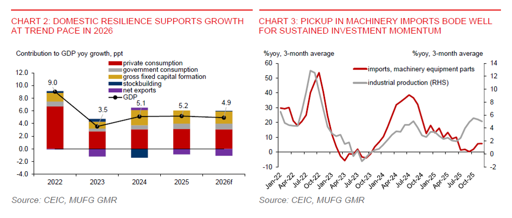 Malaysia’s domestic growth outlook has strengthened, prompting us to revise up our 2026 GDP forecast to 4.9%yoy (from 4.5% previously). This upward revision mainly reflects a strong Q4 GDP print, sustained momentum in investment and exports, and a lower US tariff rate on Malaysia.
