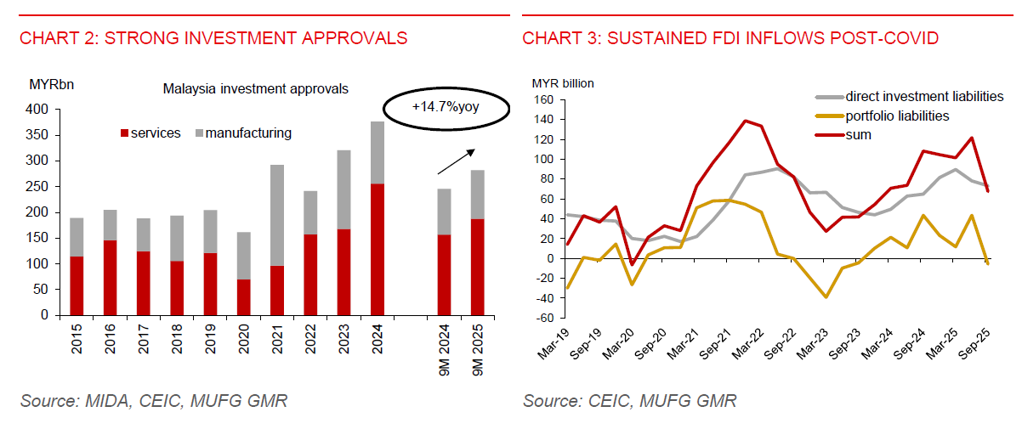 Malaysia’s economy remains in an ICT‑led investment upcycle, with total investment approvals across the manufacturing and services sectors rising 14.7%yoy in 9M25. Notably, ICT has emerged as the largest contributor to approved investments, underpinned by strong foreign participation, with ICT investment approvals growing by around 32%yoy over the same period.