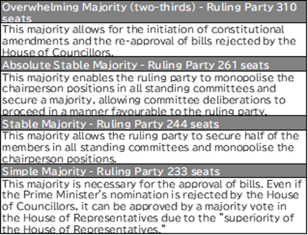 The ruling Liberal Democratic Party (LDP) won a decisive victory in the Lower House election held on 8 February, securing 316 seats (Figure 1). The result not only clears the simple majority threshold of 233 seats, but also delivers an absolute stable majority that allows the LDP to control committee chairmanships across all standing committees. Seat gains also exceeded the two-thirds threshold of 310 seats required to initiate constitutional revision (Figure 2).