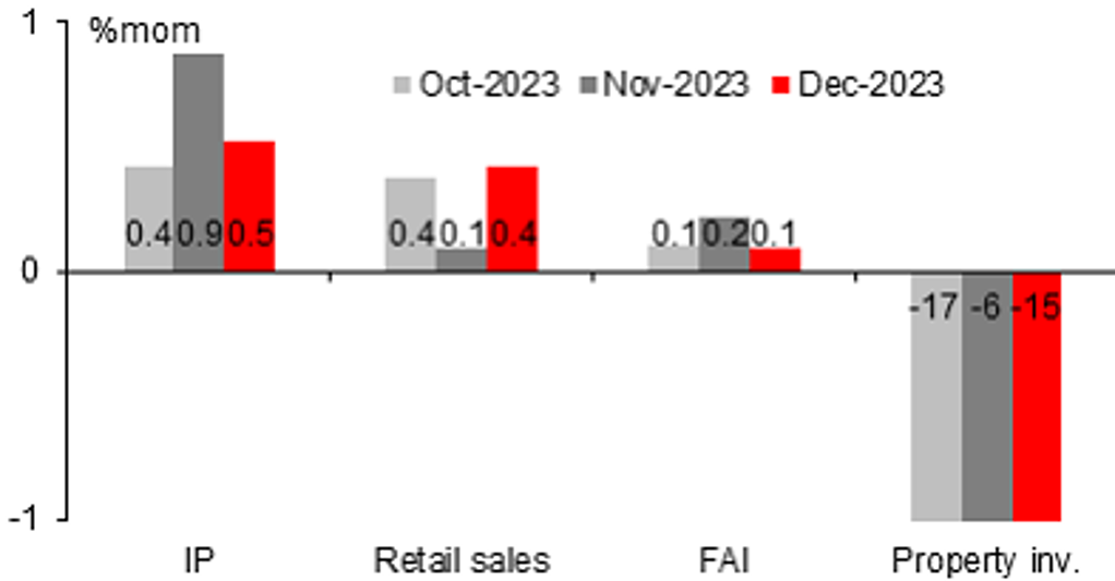 China’s consumption-led economy grew by 5.2%yoy in 2023, slightly higher than its growth target of “around 5%” set by NPC in last March. However last year’s robust consumption contribution to overall GDP growth will likely moderate this year, as the reopening effect dissipates. Recent December data showed that the economy was on expansion, with an accelerating sequential retail sales growth and decelerating sequential growth of industrial production and fixed asset investment. And December was another month with weak property activities. The Chinese economy started the year 2024 with some improvements in January NBS composite PMI (50.9 vs. 50.3 in December) and NBS non-manufacturing PMI (50.7 vs. 50.4 in December). January NBS manufacturing PMI increased marginally to 49.2 from 49.0 in December, still indicating persistent contractions in the manufacturing sector despite a slower pace of contraction. Both manufacturing new orders and new export orders PMI edged up slightly but were still below 50.0.