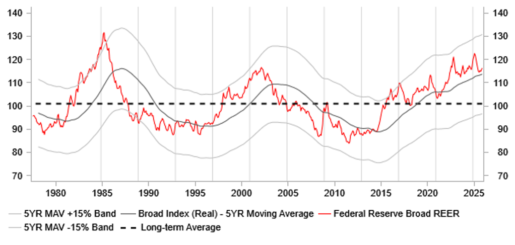 Potential more proactive fiscal policy and a continued rebalancing for a better growth model and growth in 2026 likely provide some tailwinds for CNY. The extent of appreciation, however, is likely limited. We anticipate persistent, though less severe, deflation throughout 2026, with the GDP deflator not expected to turn positive until 2027. Risks to the currency outlook depend heavily on the level of policy support, broader U.S. dollar performance, and external market conditions.