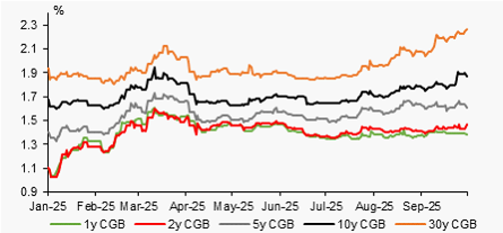 The 10y CGB yield edged higher by 9bps to 1.87% at the end of the month, and the 30-year CGB yield also rose, by 18bps to 2.26%. The rise of bond yields was largely due to the ongoing asset rotation into the stock market, as China’s overall stock index kept advancing in recent months. The factors that drove the recent stock market rally likely are structural, including AI and the “anti-involution” campaign, and the government still is keen to maintain the gains in stocks. We noted the overall tone of the PBoC monetary policy committee regular meeting for Q3 2025 played down the possibility of rate cuts – this may reflect PBOC’s concern of over-heating. Given weakness in recent data and incoming export headwinds due to higher global tariffs, more policy easing is needed. Without forceful fiscal easing, PBOC’s policy rate cut can help to reduce pressure and lower the funding costs of the economy, as well as mortgage payments for households. We don’t expect long-end government bonds to rise further, as improving bank liquidity conditions (more deposits, and weak loans) will prompt bank purchases of bonds, and weigh on bond yields. We expect the 10y CGB yield to remain around current levels in Q4 and Q1 next year.