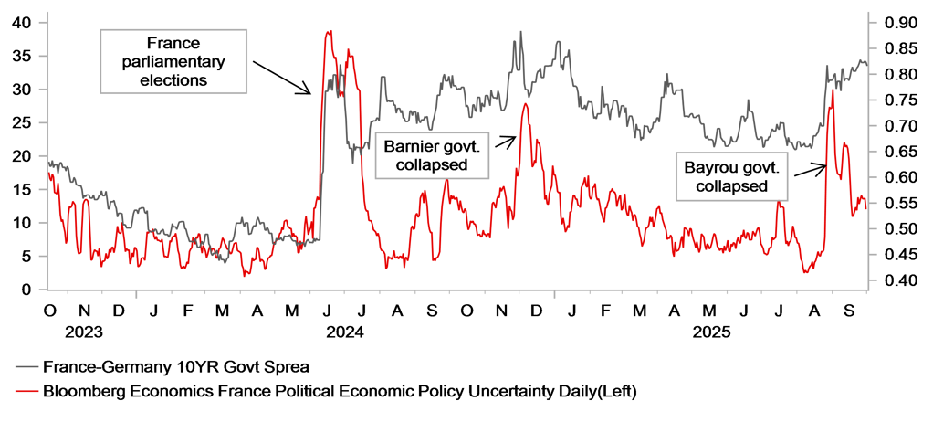New French PM Lecornu has committed to naming a new parliament for the start of the parliamentary session on 1st October but it remains unclear whether he can create a budget plan that will garner the support required in parliament. PM Lecornu has hinted that he will target a slightly wider budget deficit (4.7% vs 4.6% previously) for the coming year, so this indicates only a very small degree of wiggle room for negotiations. Lecornu also ruled out changes to President Macron’s pension reforms and appears against a wealth tax. Indications from the far-left and far-right blocks are that there will be no support for this new government. The OAT/Bund spread has widened further and the risk of new parliamentary elections is now partially priced. Official data released confirmed France’s debt at EUR 3.4trn, or 115.6% of GDP and is now the third largest after Greece and Italy. Fitch Ratings downgraded France’s sovereign rating from AA- to A+ based on risks that the debt level will continue rising in part due to political gridlock. Previous episodes of political uncertainty in France have tended to have only a marginal and temporary impact on euro performance.