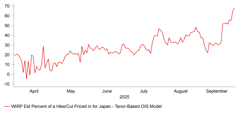 There has been a gradual increase in pricing for a 25bp hike by the BoJ on 30th October. At 16bps the market is still short of fully priced but we see rates moving higher in anticipation of a hike. The July BoJ meeting minutes indicated growing support for a hike while a speech from board member Noguchi suggests 3 members are now on board (Tamura & Takata already voted for a hike in Sept). Speeches by Dep Gov Uchida (2nd Oct) and Gov Ueda the following day will be important as well as the Tankan report for Q3. We believe these events will strengthen the case for a hike and assuming Koizumi wins the election, a hike is very likely in October.