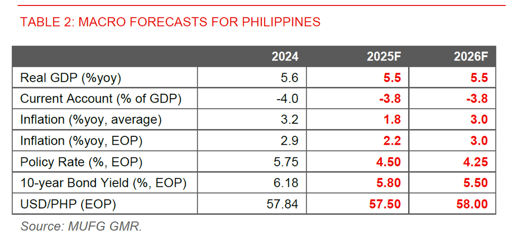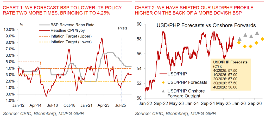 - From an FX perspective, we correspondingly shift our USD/PHP forecast higher, and see the FX pair moving to 57.00 by 2Q2026 from 56.50 previously, reflecting the additional BSP rate cuts.