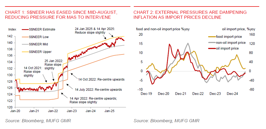 Until there is clear evidence of economic deterioration, our bias is for the MAS to maintain its current policy stance. The level of S$NEER since the July policy review has remained broadly stable, similar to the level with the preceding three months. The S$NEER has also eased in recent weeks, moving away from the top of the policy band. This moderation suggests that MAS is not facing immediate pressure to intervene, and it may be comfortable with the current level of the exchange rate, amid resilient growth and subdued inflation.