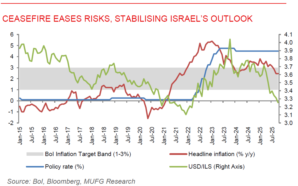 Israel outlook upgrade reflects reduced geopolitical risk. S&P revised Israel’s sovereign credit outlook to “stable” from “negative”, while affirming its rating at ‘A/A-1’, citing reduced security risks following US-brokered ceasefire between Israel and Hamas. The truce, supported by the US, Qatar, Turkey, and Egypt, has helped contain direct military confrontation and created space for economic recovery. Israel’s GDP, which contracted 4% y/y in Q2 due to the conflict with Iran, is expected to rebound strongly, reaching 5% growth in 2026 as consumer confidence and labour supply recover. Fiscal deficits are projected to narrow gradually 4.8% of GDP by 2026, supported by lower defence spending and improved revenues, though debt will remain elevated at about 67% of GDP through 2028. S&P highlighted Israel’s robust external position, with international reserves exceeding USD232bn and a current account surplus averaging 3% of GDP, reflecting strong tech exports and domestic savings. The stable outlook assumes the ceasefire holds and broader regional tensions stay contained, while sustained growth and fiscal improvement could lead to an upgrade. Elevated defence needs, political uncertainty ahead of elections, and lingering geopolitical risks remain key constraints on Israel’s credit profile.