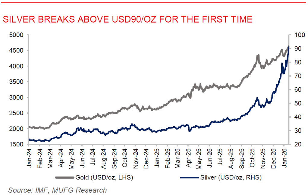 Silver breaks above USD90/oz from weaker US inflation and geopolitical risks. Silver soared above USD90/oz for the first time ever and gold climbed toward record levels as softer than expected US inflation data reinforced expectations of Fed rate cuts, boosting demand for safe haven asset amid continued geopolitical uncertainty. Silver advanced as much as 3.6%, while gold traded near historic highs, with soft US price pressures helping underpin markets’ anticipation of easier monetary policy later in the year. Persistent tensions, including political pressure on the Fed and geopolitical flashpoints, have lent further support to precious metals, with some possibility that silver and gold could reach new milestones in the coming months. Markets are also watching a US section 232 investigation that could lead to tariffs on silver, potentially tightening available inventories.