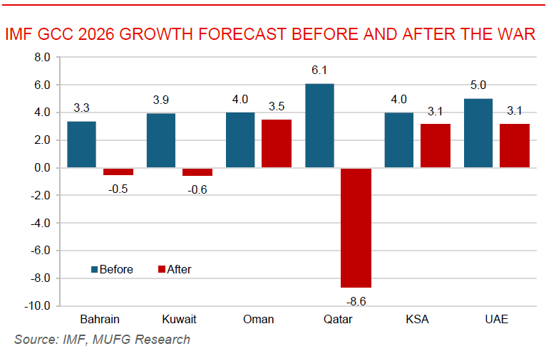 IMF cuts global growth outlook amid oil shock and war risks. The International Monetary Fund (IMF) downgraded its global growth forecast to 3.1% for the year from 3.3%, citing the economic fallout from the Middle East conflict, which has triggered a major energy shock and heightened uncertainty. The near-closure of the Strait of Hormuz and resulting surge in oil prices are expected to drive inflation higher and weigh on economic activity, particularly in emerging markets where growth was revised down to 3.9%. while the baseline assumes a short-lived conflict, the IMF warned that prolonged disruptions or severe damage to energy infrastructure could push global growth as low as 2%, near recession levels, with inflation rising sharply. Advanced economies are relatively less affected, with the US still expected to grow 2.3%, but Europe faces more pronounced slowdowns, and the Middle East region is set for a sharp deceleration. Overall, the outlook has “abruptly darkened”, with risks tiled to the downside as the trajectory of the conflict and energy markets remains highly uncertain. The IMF is set to release its Regional Economic Outlook for the Middle East this Thursday.