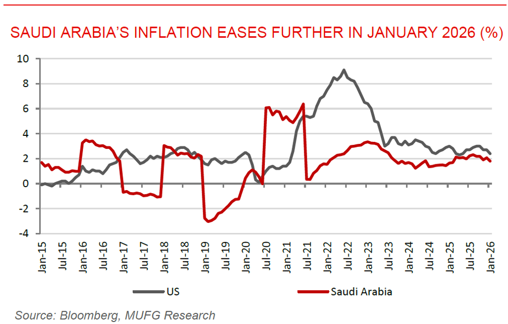 Saudi Arabia’s inflation ease further in January 2026. Saudi Arabia’s CPI eased to 1.8% y/y in January 2026, down from 2.1% y/y in December 2025, signalling a continued moderation in price pressures at the start of the year. The slowdown reflects softer increases across key components of the consumer basket, particularly in housing, utilities, and transportation, which have historically been major contributors to h headline inflation. The January reading suggests that inflation dynamics remain subdued and broadly stable, supporting household purchasing power and reinforcing expectations of limited near-term inflationary risks within the Kingdom’s macroeconomic framework.