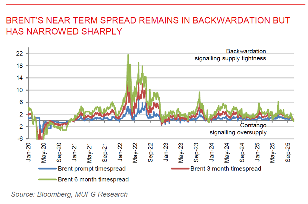 Oil prices ease amid trade optimism and oversupply concerns. Oil prices declined after a third consecutive weekly loss, as traders balanced optimism over easing US-China trade tensions with concerns about a growing supply surplus. Brent hovered near USD61/b and WTI around USD57, as upcoming trade talks and President Trump’s remarks about potential tariff relief lifted market sentiment. However, China’s economic slowdown and weak domestic demand weighed on outlook. The International Energy Agency warned that the global oil market faces an even larger surplus into 2026, pressuring prices despite occasional spikes from Ukraine attacks on Russian infrastructure. Market structure signals also point to weakening momentum, Brent’s near term spread remains in backwardation but has narrowed sharply, while longer-dated contracts slipped into bearish contango, underscoring a softening market.