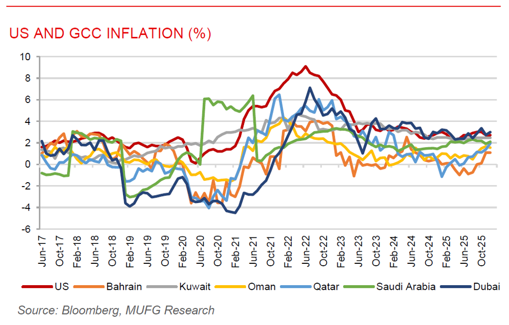 Oman and Dubai inflation trends. Oman’s annual inflation rate eased to 1.6% y/y in December, down from 1.7% y/y in November, driven mainly by slower increases in transport costs and slight declines in some service categories, while food and non-alcoholic beverages and miscellaneous goods continued to register price increases. Other CPI components such as housing utilities, clothing, communication, and health services remained broadly stable, and monthly prices edged down by 0.1%, pointing to contained short-term inflationary pressures. In contrast, Dubai’s CPI inflation accelerated to 3.0% y/y from 2.7% y/y, led by higher transport and food prices, with transport inflation picking up due to elevated petrol prices, while the housing components, the largest weight in the CPI basket, continued to moderate, helping to offset some of the upward pressure and suggesting that although near-term cost pressure rose, underlying price momentum was beginning to stabilise.