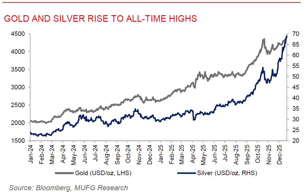 Gold hits record high as rate cut bets and geopolitical risks fuel rally. Gold surged to a fresh all-time high above USD4,381/oz, driven by heightened geopolitical tensions and growing expectations that the Fed will deliver additional interest-rate cuts. Investors are increasingly positioning for looser US monetary policy into 2026, a supportive backdrop for non-yielding assets, while demand has been further underpinned by sustained central bank purchases and steady inflows into gold-backed ETFs. Rising global tensions have also boosted safe-haven demand, adding momentum to gold’s rebound from its October pullback. Collectively, precious metals are on track for their strongest annual gains since 1979, with several major banks projecting further upside in 2026 as investment demand increasingly competes with central banks for limiting physical supply.
