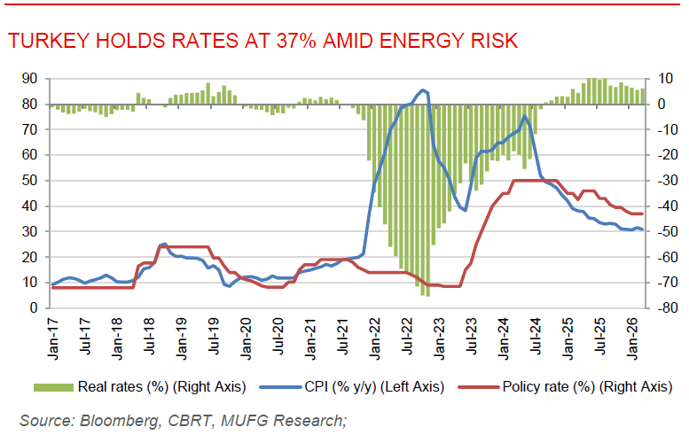 Turkey holds rates at 37% amid inflation and energy risks. The Central Bank of Turkey (CBRT) kept its key policy rate unchanged at 37%, while maintaining a tightening bias as it remains highly alert to inflation risks stemming from volatile energy prices and broader geopolitical disruptions. The CBRT noted that underlying inflation eased in March but could rise slightly in April, warning that any significant and persistent deterioration in the inflation outlook may require further tightening. While slowing domestic economic activity offers some relief, policymakers remain concerned about second-round inflation effects from higher oil prices and potential spillovers into food and core goods prices. Despite the external shock, Turkey’s economic framework has remained relatively resilient, with dollarisation stable at around 40%, limited pressure on foreign exchange markets, and reserves helping absorb temporary capital outflows. The CBRT’s slightly faster currency depreciation path is seen as a measured response to external pressures rather than a policy shift. Overall, the base case remains for rate cuts to resume in mid-2026 if geopolitical tensions ease and energy prices decline, with the policy rate expected to end the year at 31%, though risks remain tilted toward tighter policy if inflation pressures persist.
