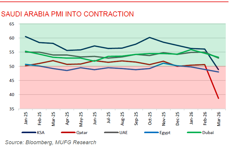 Saudi economy remains resilient despite oil disruptions. Saudi Arabia’s economy has shown notable resilience despite significant disruption from regional conflict, with higher oil prices helping offset a sharp decline in production and broader economic pressures. Saudi crude output fell 23% m/m in March to 7.76mb/d due to geopolitical disruptions, but a more than 60% surge in Brent prices helped cushion revenue losses. While uncertainty linked to the US-Iran conflict weighed on business activity, pushing the PMI into contraction at 48.8, and real estate transactions fell sharply, broader economic fundamentals remain relatively strong. Real GDP expanded 5% in Q4 2025, inflation remained contained at 1.8%, consumer spending rose 8.4%, and Saudi unemployment declined to 7.2%. Non-oil diversification also continued to gain traction, with non-oil exports rising 15.1% y/y to USD8.3bn, supported by stronger re-exports and trade links with key partners such as the UAE, India, and China. Despite emerging fiscal pressures from weaker oil volumes and higher spending, the outlook remains relatively constructive, with the IMF projecting 3.1% growth in 2026 as the kingdom continues advancing its Vision 2030 agenda.